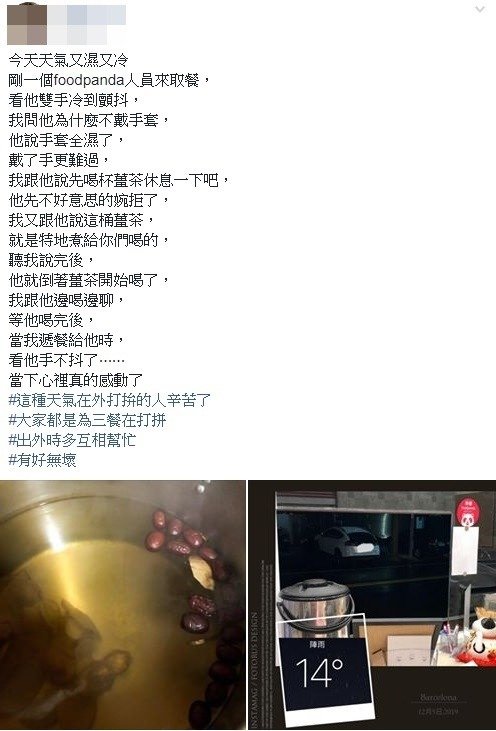 ▼這名網友在店內準備了一桶薑茶,趕緊請外送員喝一杯休息一下。外送員剛開始不好意思,婉拒了,後來網友表示薑茶是特地準備給外送員喝的,對方才開始喝。「等他喝完後,當我遞餐給他時,看他手不抖了。當下心裡真的感動了。」