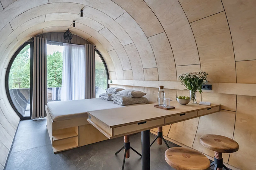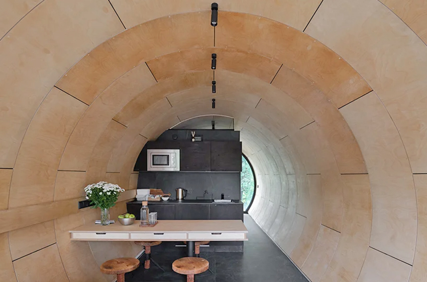 這棟建築的外表是冰冷的管道,內部卻是溫馨的家居空間。到森林中露營、住在裡面的話,應該能身心舒暢,非常治癒吧~