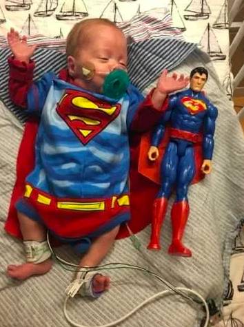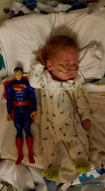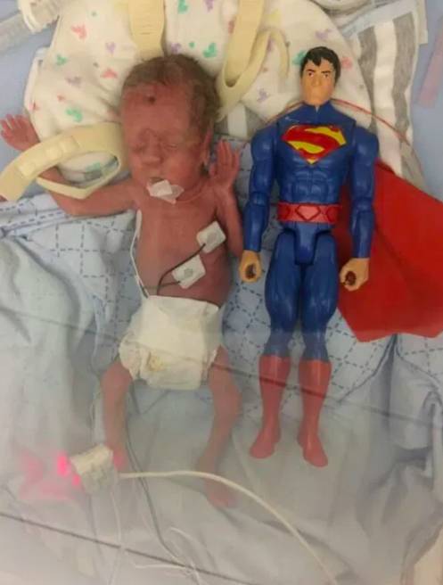 ▼剛剛出生的Logan只有680g重、30cm長。醫生建議Rob給孩子準備一個參照物,能夠清楚看到孩子的成長。Rob買了一個超人玩具,他堅信自己的孩子足夠堅強,一定能夠熬過這段艱難的時期。