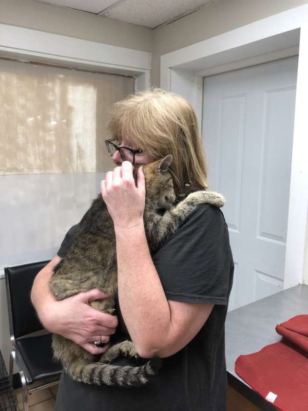 ▼原來Tiger跑到了另一戶人家Carol O’Connell的院子裡。當時牠非常害怕,Carol給牠提供食物,牠卻謹慎地不讓人靠近,經常消失好一陣子才會出現。Carol和兒子花了3年時間才贏得牠的信任,終於能夠接近牠。Carol在動物保護協會工作,她跟貓咪互動時,發現牠以前應該是有家的,於是她帶回一台晶片掃描器,看到了Tiger身上晶片的訊息。