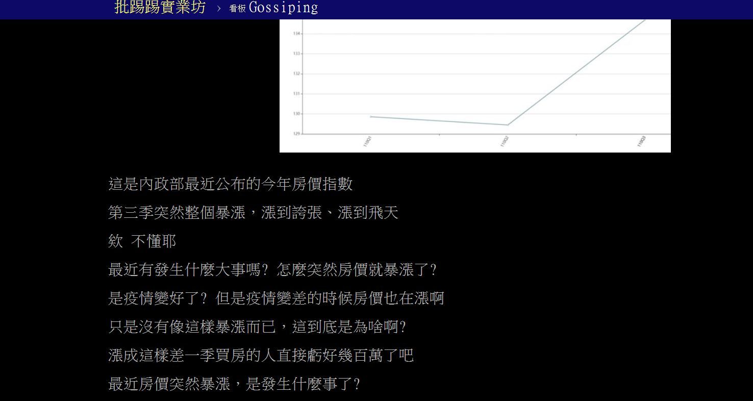▼原po表示:「內政部最近公布的今年(2021年)房價指數,在第三季突然整個暴漲,漲到誇張、漲到飛天欸,不懂耶,最近有發生什麼大事嗎?怎麼突然房價就暴漲了?是疫情變好了?但是疫情變差的時候房價也在漲啊,只是沒有像這樣暴漲而已,漲成這樣差一季買房的人直接虧好幾百萬了吧,最近房價突然暴漲,到底是發生什麼事?」