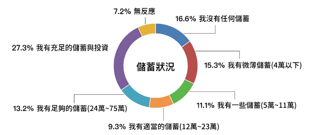 ▼在儲蓄方面,調查顯示3成民眾沒有儲蓄或儲蓄在4萬元以下。不過27.3%的民眾儲蓄在75萬以上,認為自己的儲蓄很充足;認為自己有適當儲蓄,儲蓄為12萬至23萬的卻只有9.3%。這說明民眾在儲蓄上面臨兩極化現象。民眾的銀行帳戶持有率超過9成,但45%的民眾只會使用存提款、轉帳與匯款這一些基本功能,根本不知道還有其他的功能可以用。