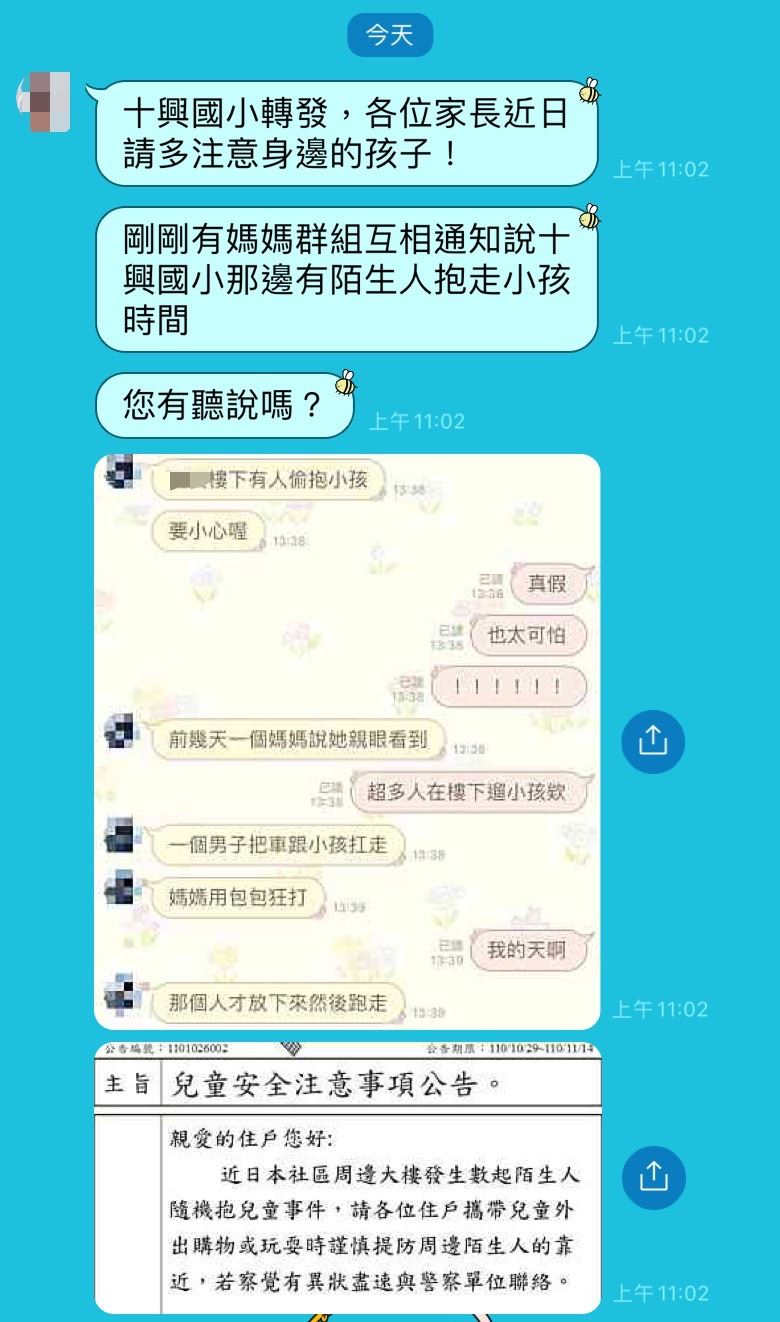最近「學校周遭有陌生人抱走小孩」、「陌生人隨機抱兒童」等訊息在案發社區大樓、地方家長群組瘋傳。有人表示親眼看到一名男子把車和小孩扛走,媽媽用包包狂打,那名男子才放下孩子跑開。當地家長都非常緊張,警方得知後不敢大意,立刻調閱監視器查看情況。
