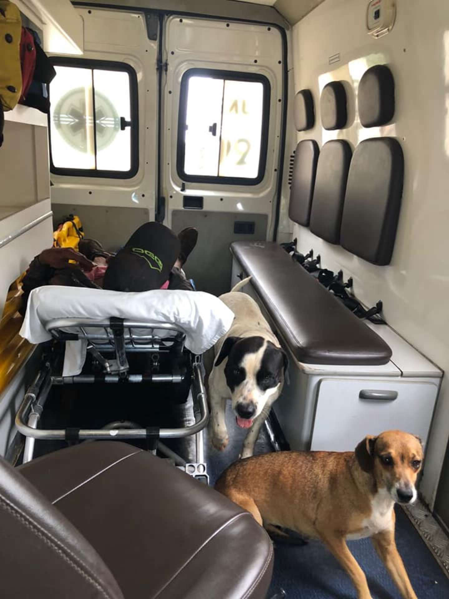 ▼護理人員Patricia Iolanda表示,José倒在地上抽搐時,2隻狗狗就守在他身邊,不肯讓醫護人員接近。後來醫護人員試著卸下狗狗們的心防,才順利將José抬上救護車。他們擔心狗狗們會追著救護車跑,就決定讓狗狗們坐上車,陪著José一起去醫院。