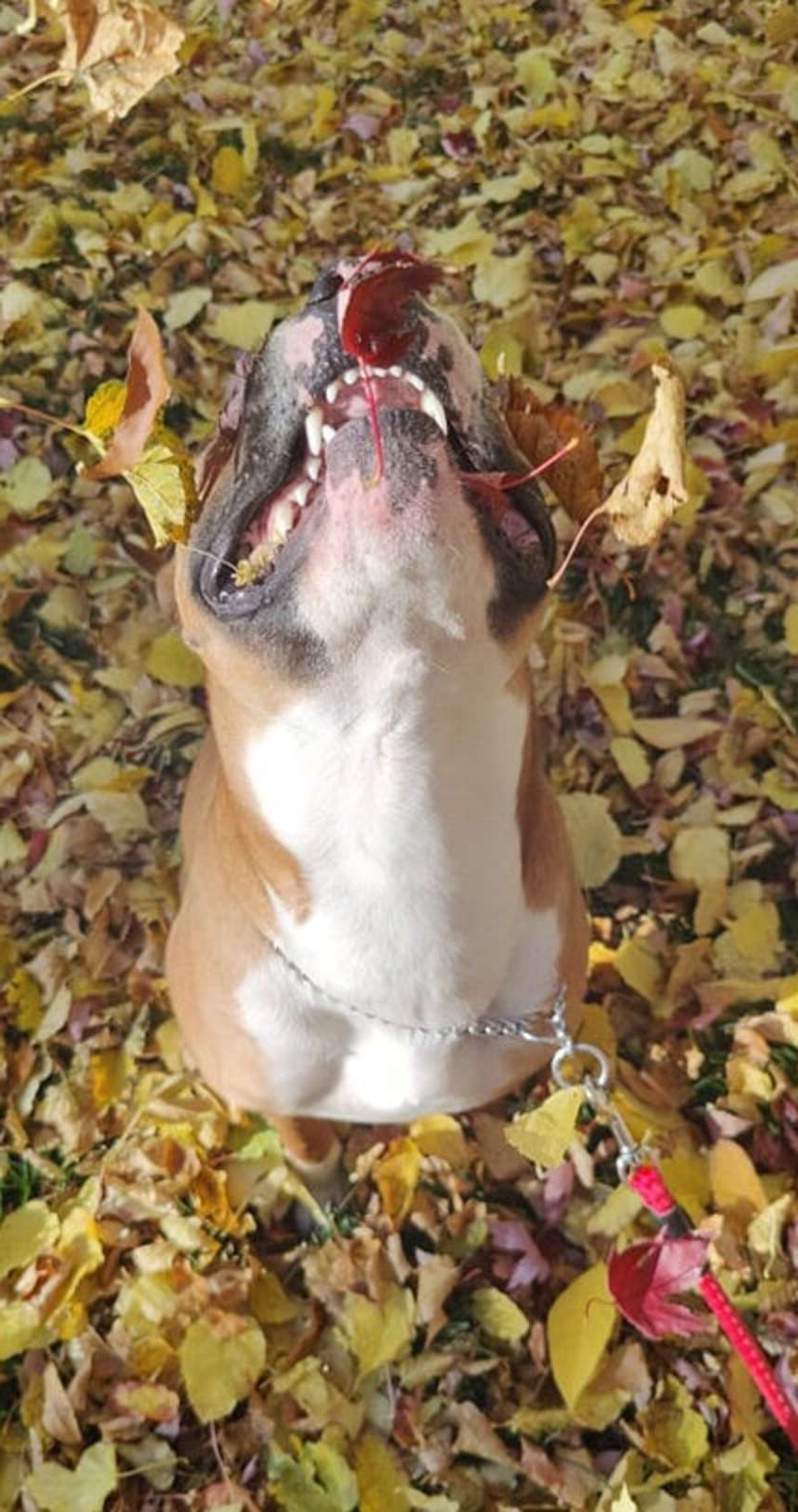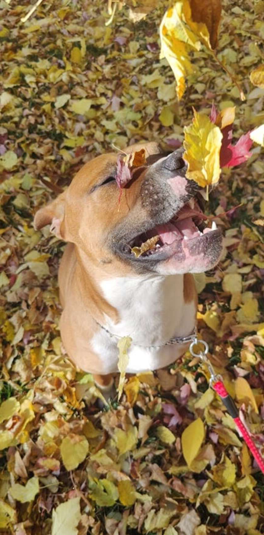 ▼Amanda說:「牠精力充沛,對一切都很好奇。牠最喜歡散步,有時候還會興奮地蹦蹦跳跳、轉圈圈。」那天Amanda帶Max外出時,發現Max對落葉非常好奇,牠還試著去咬那些剛剛從樹上落下來的黃葉。