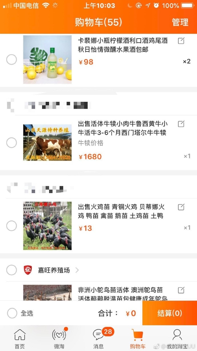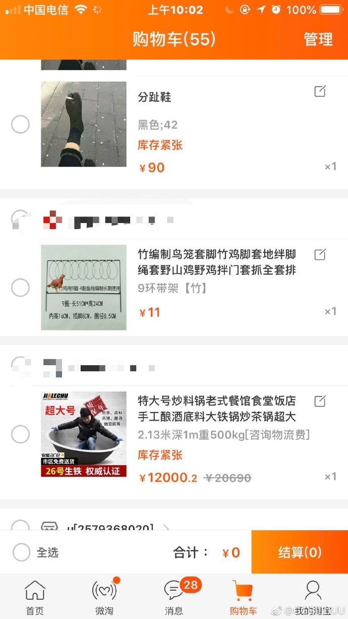 ▼他的購物車中有不少小動物的連結,還有一些很瘋狂的東西,比如500kg重的炒鍋、火雞、大耳山羊、蜂王、飛機等等。那晚他喝多了,不小心誤點,這才買下了藍孔雀、小香豬和娃娃魚。