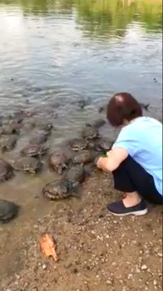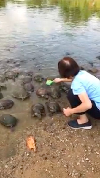 ▼Ariffin認為,那名女子可能想幫烏龜們清潔龜殼上的青苔。烏龜們也很享受輕輕刷背的感覺。「烏龜們開心朝她跑過來,等刷完背後就離開了。這溫馨的畫面非常療癒。」