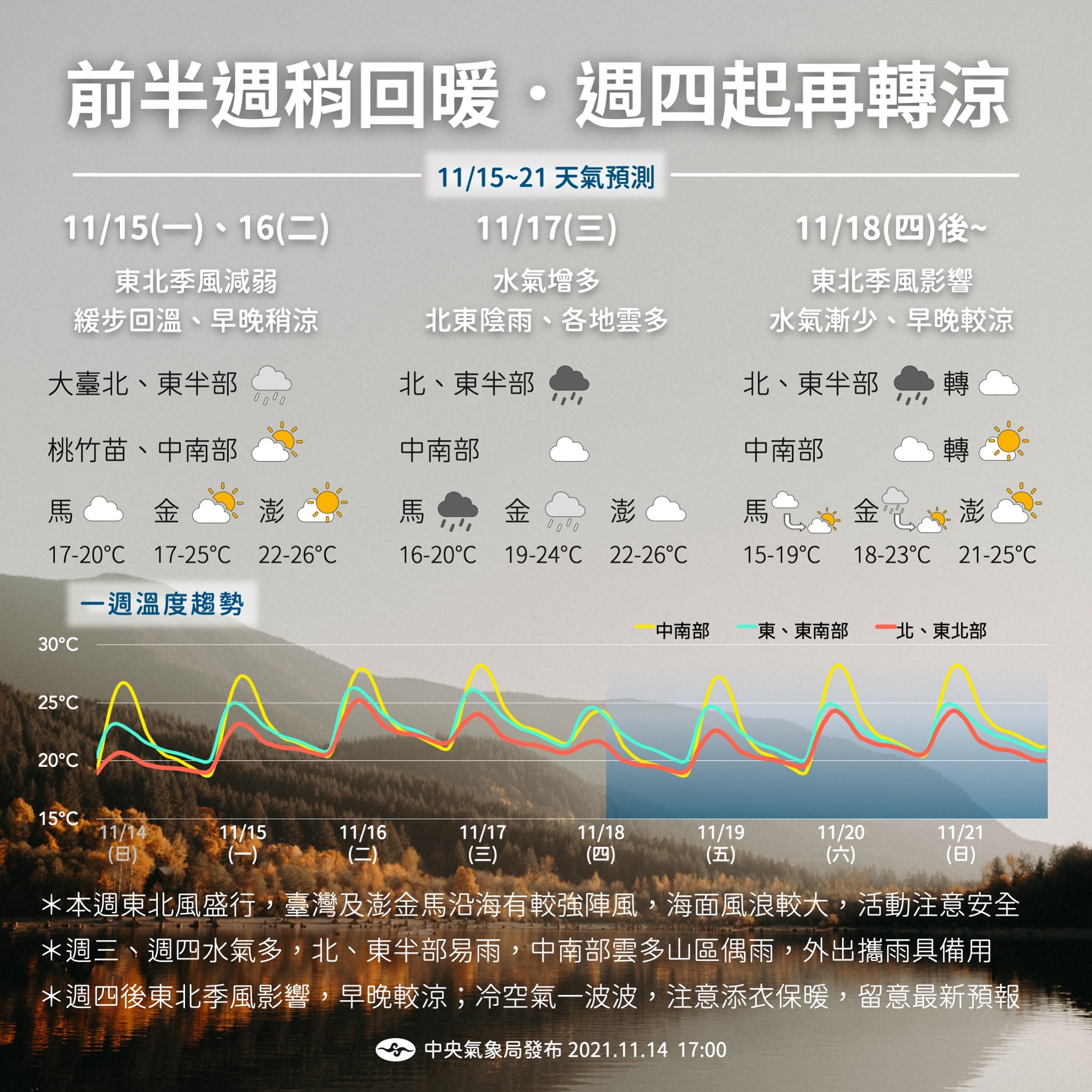 2021年11月17日又要變天了!中央氣象局表示,今天(17日)水氣開始增加,中部以北及東北部雲量增多,北部、東半部地區及中南部山區有局部短暫雨。明天(18日)東北季風稍微增強,天氣轉濕冷,週末天氣再度回暖。下週一(22日)會有強冷空氣報到,一直影響到下週四(25日),最低溫落在下週二、三(23、24日)。