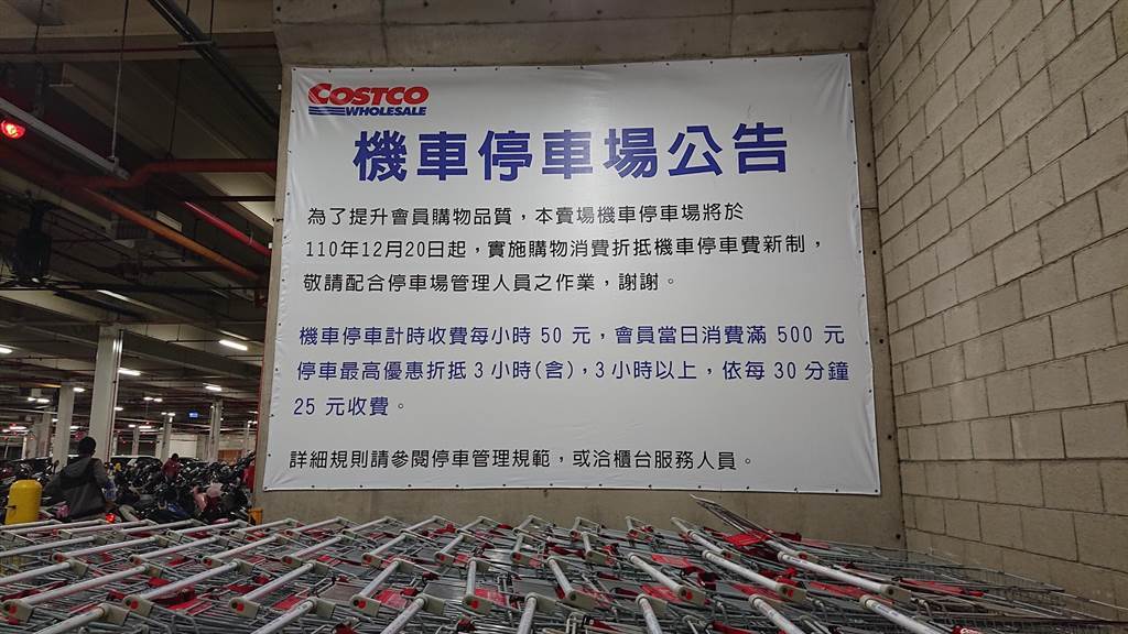 一名網友在臉書社團「Costco好市多 商品經驗老實說」貼出好市多高雄大順店的機車停車場公告:「為了提升會員購物品質,本賣場機車停車場將於110年12月20日起,實施購物消費折抵機車停車費新制,敬請配合停車場管理人員之作業,謝謝。機車停車計時收費每小時50元,會員當日消費滿500元停車最高優惠折抵3小時(含),3小時以上,依每30分鐘25元收費。」