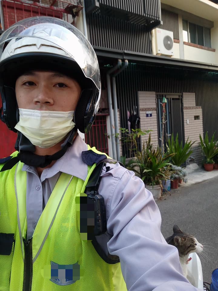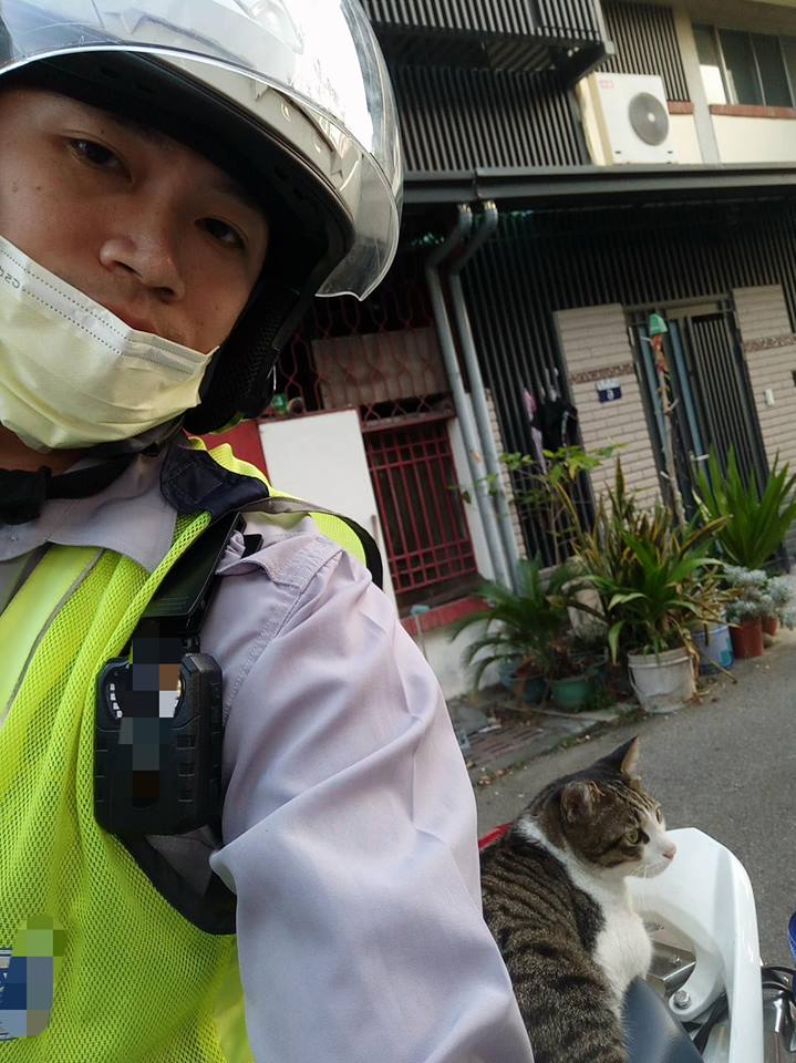 ▼那天陳威良巡邏途中遇到了一隻可愛的貓咪。他忍不住停車,摸了貓咪兩下。沒想到那隻貓咪把這當成了邀請,乾脆利落跳上他的車後座,還趴好趴滿,堅決不下來。
