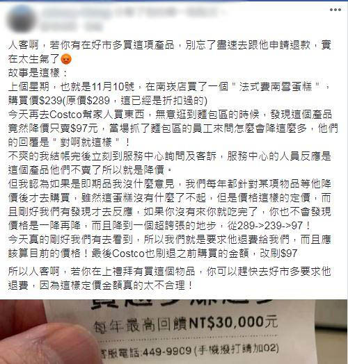 ▼原po表示,他當時在好市多南崁店買了一個「法式費南雪蛋糕」。蛋糕原價289元,折扣過後239元。9天後他再去好市多買東西,逛到麵包區時發現這款蛋糕竟然降價只賣97元。他立刻去問麵包區的員工,為什麼會降這麼多,員工表示:「對啊就這樣!」