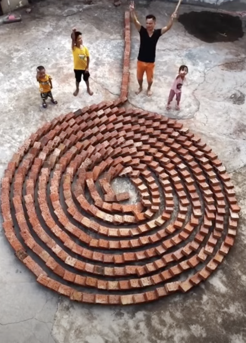 ▼這名男子把磚塊當成骨牌,排列成螺旋狀。他推倒中心的磚塊,其他的磚塊依序倒下,同時伴隨著清脆的「喀~喀~喀」聲響。當所有的磚塊都倒下,螺旋狀的圖案就像綻放的花朵,那磚塊撞擊的清脆聲音仍縈繞在耳邊。