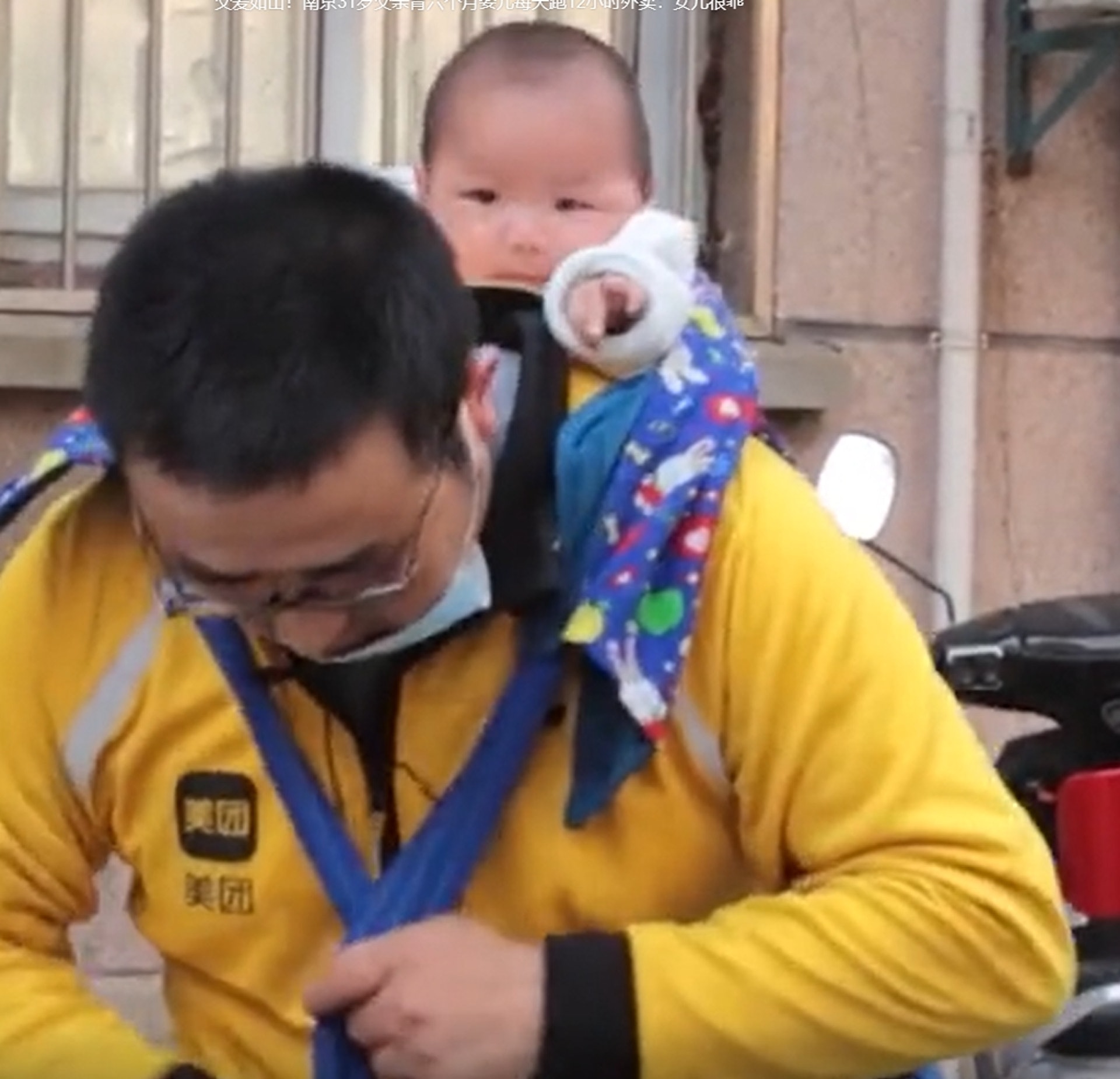 2021年11月26日南京有一位31歲的外送員小鄒,他每天背著6個月大的女兒外出送餐,風雨無阻,一天要工作12個小時。小鄒的妻子患有精神疾病,他的父母都已經過世,家中實在沒有人能照顧小孩,他只能每天背著女兒外出工作,生活非常辛苦。