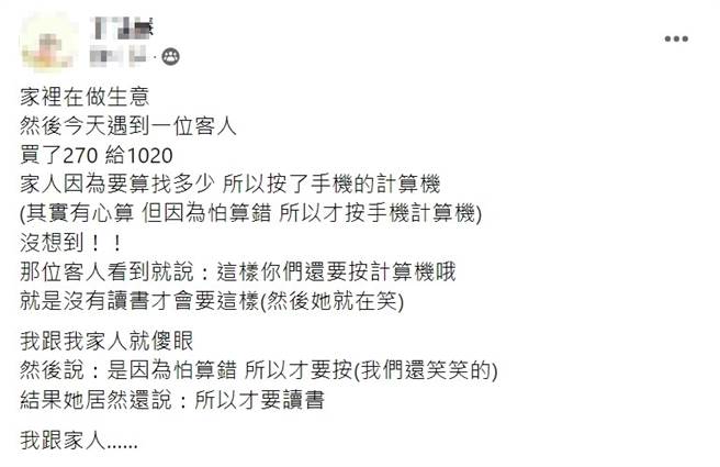 原po表示,那位女客人買了270元給了1020元。家人心算知道要找750元,但因為怕算錯,還是拿出手機使用計算機驗算一遍。沒想到客人看到這一幕,竟酸溜溜地說:「這樣你們還要按計算機哦,就是沒有讀書才會要這樣。」說完還笑起來。