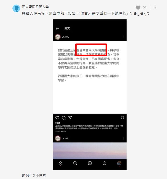 ▼蔡傑曦的道歉沒有平息大眾的怒火,更令人尷尬的是,他的原始道歉文寫的竟是「台中暨南大學」,這讓學生們更加憤怒,忍不住截圖狂嘲:「台中暨南大學…問號?樹多必有枯枝,人多必有白癡」、「讀到台大連台灣縣市都不會背喔」、「原來我讀的學校在台中啊」、「連暨大在南投不是台中都不知道,老師看來需要重修一下地理欸」、「台中XDDDD」。