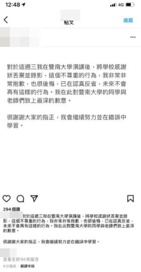 日前網紅攝影師蔡傑曦應邀前往國立暨南國際大學演講,校方在演講後致贈感謝狀與紀念品,沒想到他竟然丟進垃圾桶中,還錄影po到IG上,這一舉動引發學生怒火。眼看事件愈演愈烈,蔡傑曦在IG發文道歉,結果又寫錯學校位置,再度引發輿論撻伐。