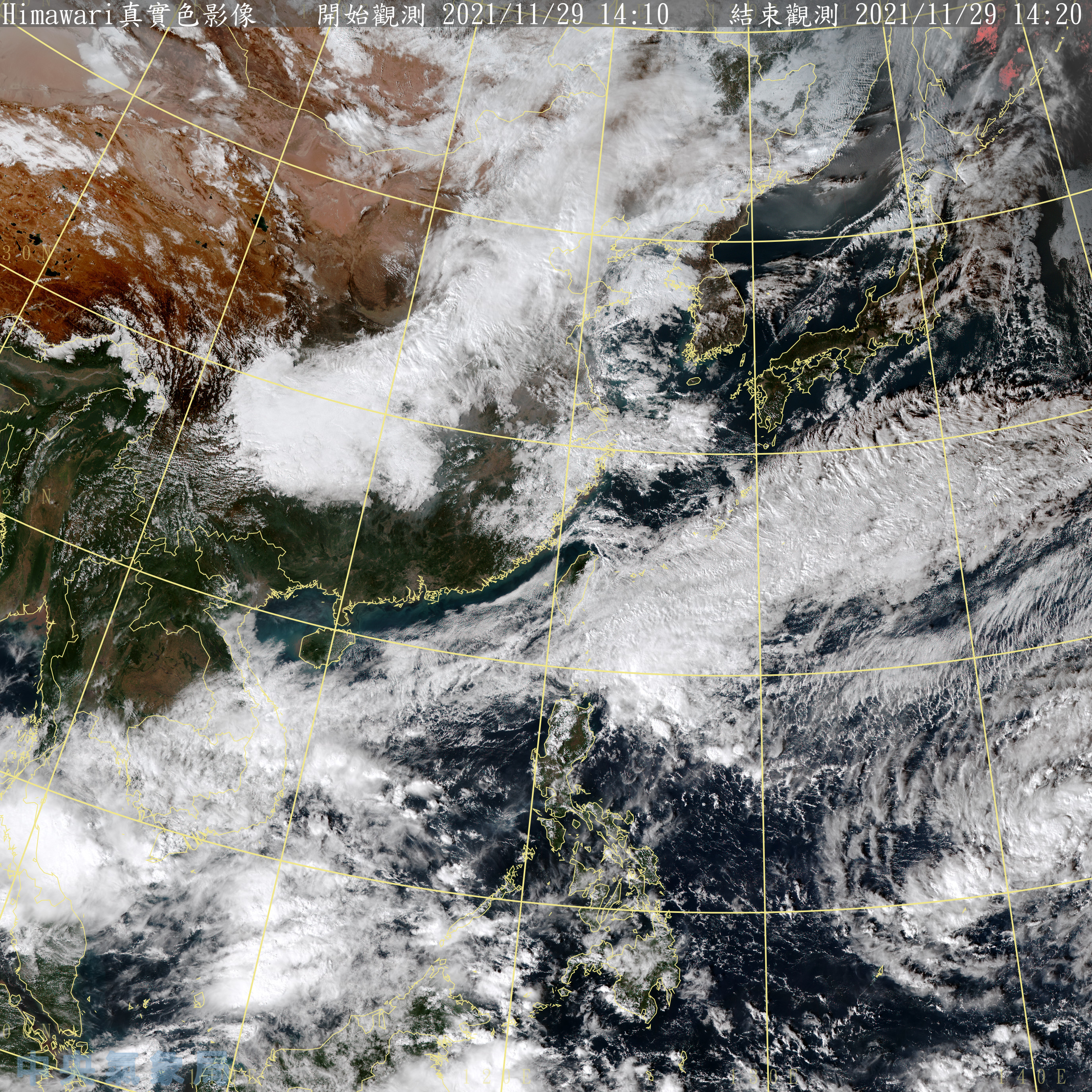 2021年11月29日台灣29日東北季風稍減弱,各地氣溫稍回升;南方雲系北移,台灣半部有短暫雨,並有局部大雨發生的機率,南部地區及澎湖、馬祖有局部短暫雨,中部地區及北部山區有零星短暫雨,其他地區及金門為多雲。30日鋒面通過,東北季風增強或大陸冷氣團南下,北部及東北部天氣要轉冷了。