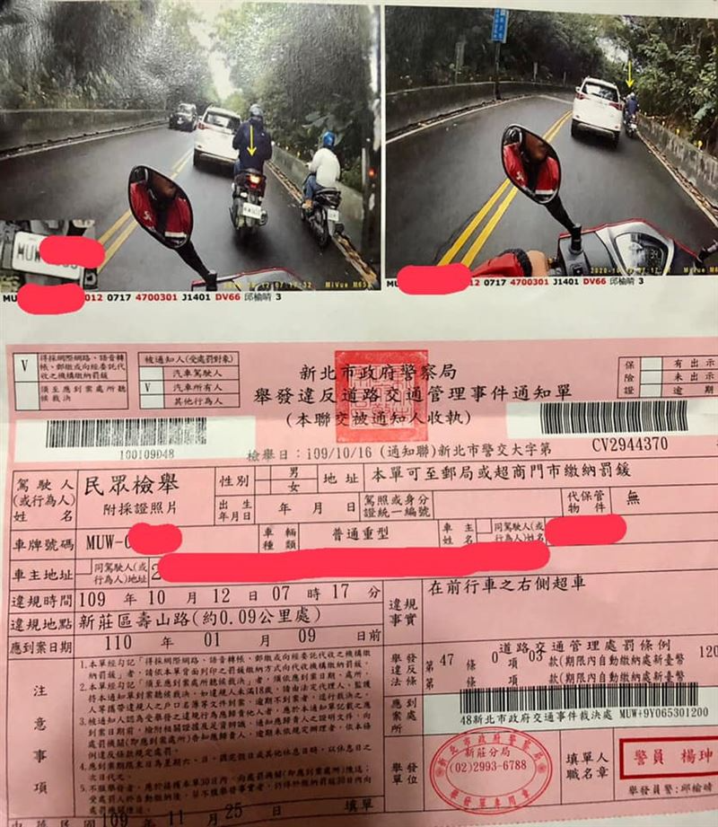 ▼被檢舉的騎士28日在臉書社團「愛新莊我是新莊人」發文,自己收到1張違規超車的罰單,壽山路真的很常被檢舉,現在都不知道該怎麼上班了,原PO還詢問,請問這種有機會申訴嗎?許多網友認為「這真的太扯了,檢舉人真的很誇張」、「右側超車確實不太好,但台灣多數機車族好像都被教育靠右騎車,自然就覺得超車也在右邊超,感覺行車教育宣導很重要」、「看完我都不知道要怎麼騎車了」、「我每天都在違規」、「離譜」。