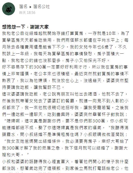 那天原po到飯局後,發現許久未見的小叔也在場。婆婆給原po敬酒說:「媳婦啊,這次真是謝謝你們,要不是你們那300萬,你小叔可能連婚都結不成,娶了你這媳婦真是我們家的福氣。」原po還不清楚發生了什麼事,小叔就說:「我女友她爸媽開出結婚條件,我必須要有房子,幸好大哥給了我300萬才解了我的燃眉之急,我下個月就可以結婚了。」