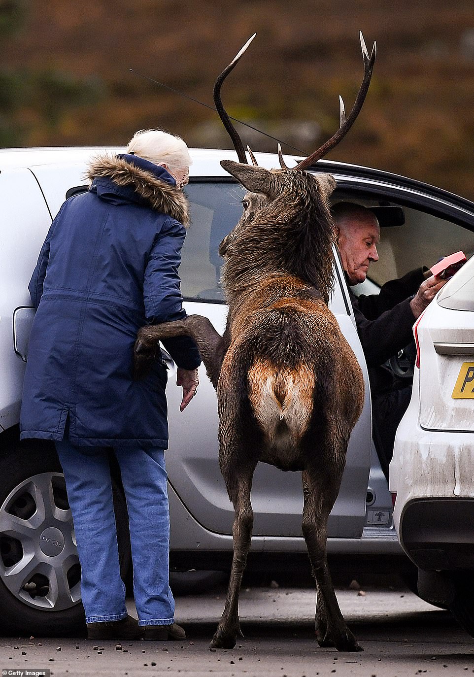▼當時這對夫妻開車途徑格倫科,可能準備去賞附近的瀑布或山間小道散步。兩隻歐洲馬鹿圍住他們的車,但他們並不驚慌,老婦人還下車來到後車門的位置。雄鹿站在老婦人右側,主動抬起蹄子放到她的手邊,她的表情非常平靜。坐在駕駛座上的丈夫則淡定查看手中的東西,也沒有將身旁的野生動物放在心上。