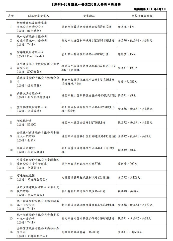 2021年12月03日財政部於2日下午公布110年9、10月期統一發票完整中獎清冊。這次共開出13張特別獎(新台幣1000萬元)及16張特獎(200萬元)。本期最令人羨慕的是一位屏東民眾,他僅花8元在文具店購買文具,就爽中1000萬元的特別獎。