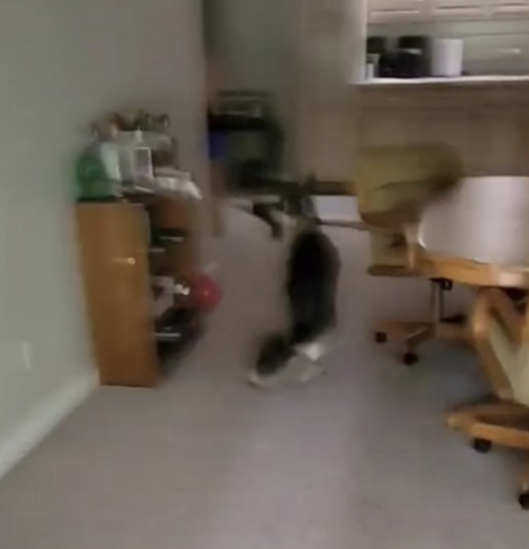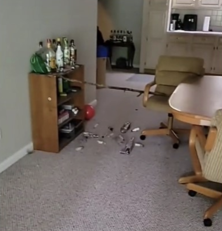 ▼那天Sadie Mae撿到一根超長的樹枝,牠非常喜歡這根樹枝,立刻叼回家準備收藏。但牠興奮過頭,叼著樹枝一進家門就直直往前衝,樹枝掃到旁邊的酒櫃,上面一整排的紅酒都被掃到了地上,樹枝也卡在酒櫃和桌子中間。飼主眼睜睜看著一瓶瓶酒落地,心都要碎了。