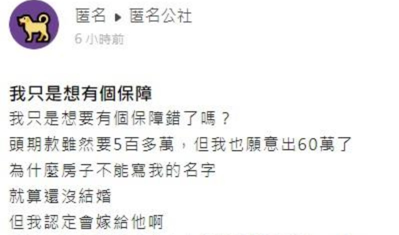 網友們看到後紛紛留言說:「出60萬就想婚前房子寫妳名字?還已打算婚後不工作?我是男的就請妳省下來,我自己買自己住,妳也不用屈就過不正常的生活了」、「所以妳結婚是犧牲?妳的人生婚後就沒了?那幹嘛結?別結了」、「妳有沒有聽過結婚了也會離婚?那離婚時房子怎辦?離婚了妳的一生可沒有被他綁著囉」。