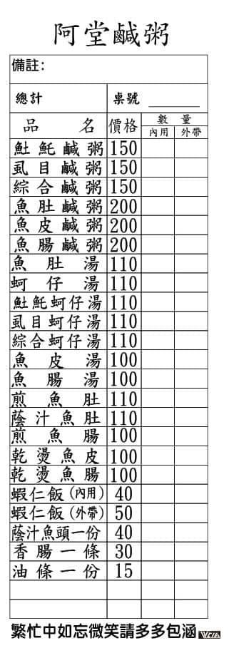 ▼阿堂鹹粥位於台南中西區圓環邊,過去經常出現在美食節目中,在當地小有名氣,也是許多觀光客必吃的名店之一。日前阿堂鹹粥在臉書粉專貼出新菜單宣布調漲,並說:「抱歉! 阿堂表示扛不住!魚貨原物料等一切食材價格跟雲霄飛車一樣直直往上衝,迫不得已自2021年11月17日調整價目表。」