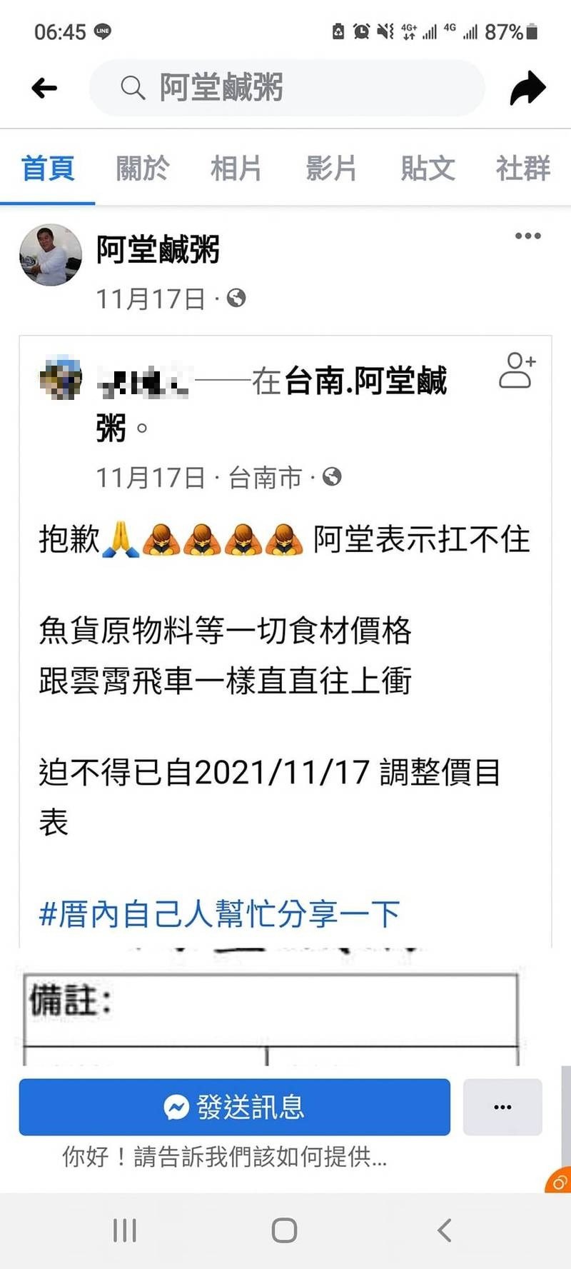 還有網友翻出幾年前的價格對比,表示:「九年前魚皮湯80魚皮鹹粥130就有人喊貴了,現在200,真的貢盤啊」、「價格根本就在坐直升機,之前根本沒這麼貴,嫌賺不夠多吧」、「八年前有美食節目去拍攝,當時候牆上魚皮鹹粥僅需要130元,如今七年過去竟然一碗要200元,漲幅爆衝50%以上」。老闆已將臉書粉專調漲的公告撤除,一些網友轉戰Google評論狂刷一星負評,現在「阿堂鹹粥」只剩3.6顆星了。
