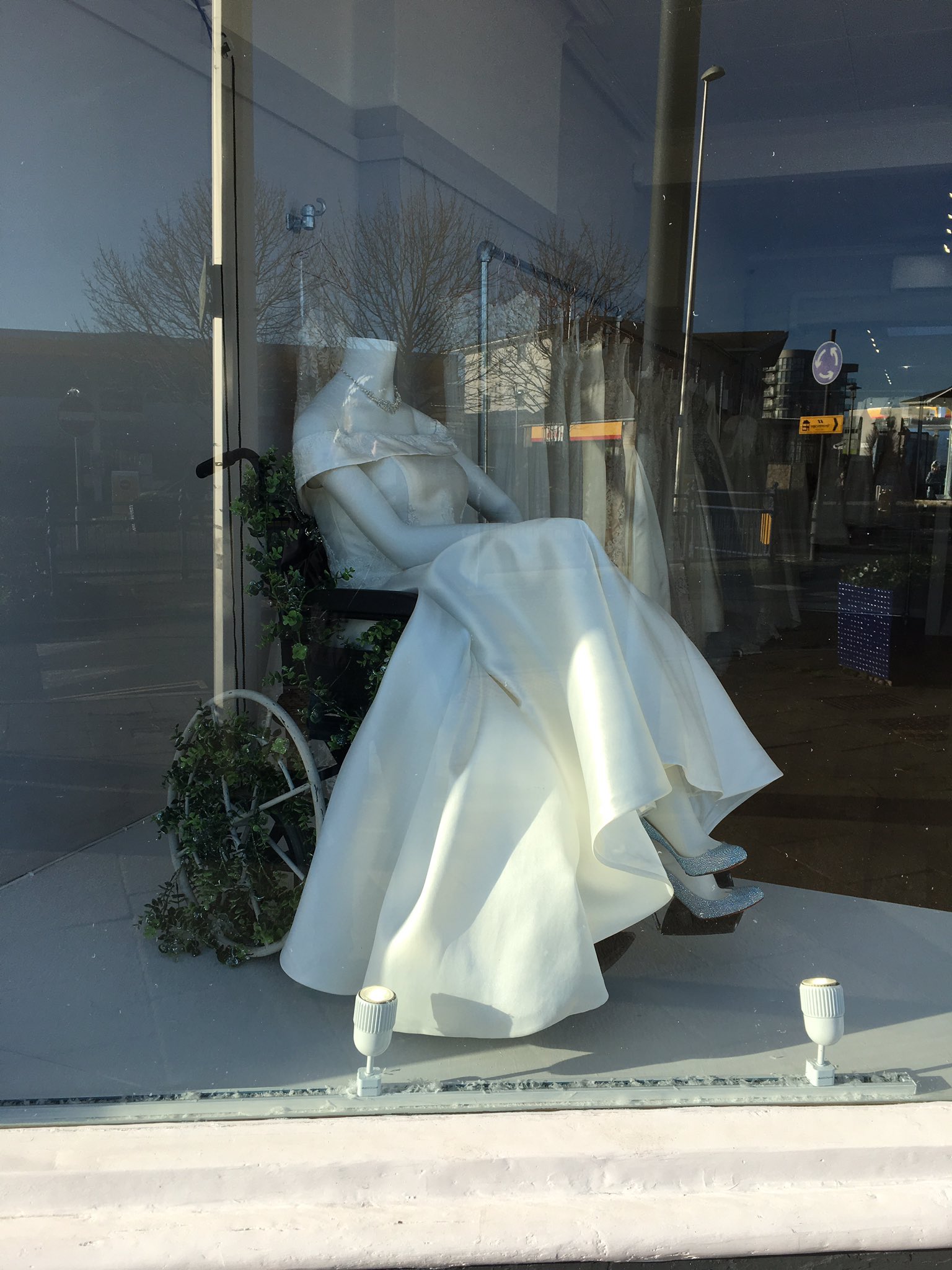2021年12月08日英國薩默塞特郡波蒂斯希德(Portishead)的一家婚紗店的櫥窗裡,擺放著一個坐輪椅的假人模特兒。這個優雅的身影引起了藝術家Beth Wilson的關注,她忍不住拍照po上網,說:「鎮上新開的婚紗店中有一輛輪椅,上面有假人模特兒,這是我第一次在商店櫥窗裡看到殘障人士的形象。」