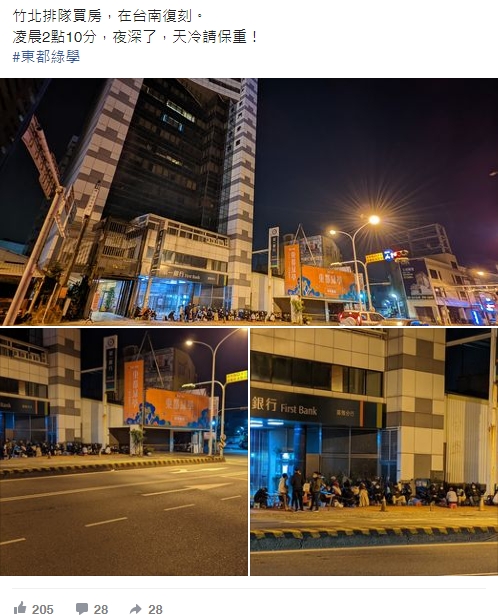 日前台南市出現了熬夜排隊買房的景象。臉書粉專「住宅週報」8日凌晨2時許,突然開直播分享罕見的畫面,只見台南市東區東門路三段一處建案接待中心旁,半夜就有20、30人熬夜排隊。拍攝影片的男子分享說,這一建案是新竹知名建商在台南的第4號作品,其第1、2號作品位於永康區鹽行,第3號作品於永康區大橋重劃區~