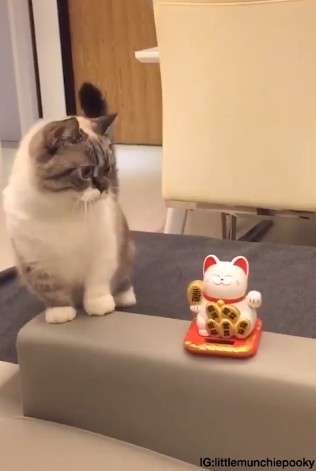 ▼一開始牠一臉疑惑的看著招財貓,可是當牠發現主人一直望著招財貓時,Pooky仿佛吃醋似的竟然開始學起了招財貓來,用後腿站立而前爪則不斷在空中揮舞!