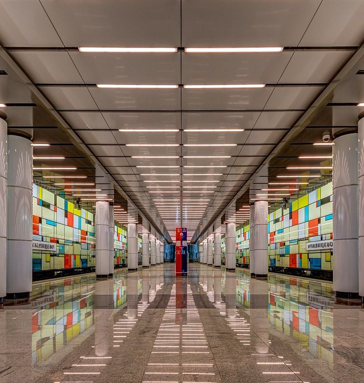 ▼俄羅斯莫斯科Rumyantsevo站:地鐵站的牆壁上裝飾著荷蘭畫家皮特蒙德里安(Piet Cornelies Mondrian)風格的彩色磁磚。