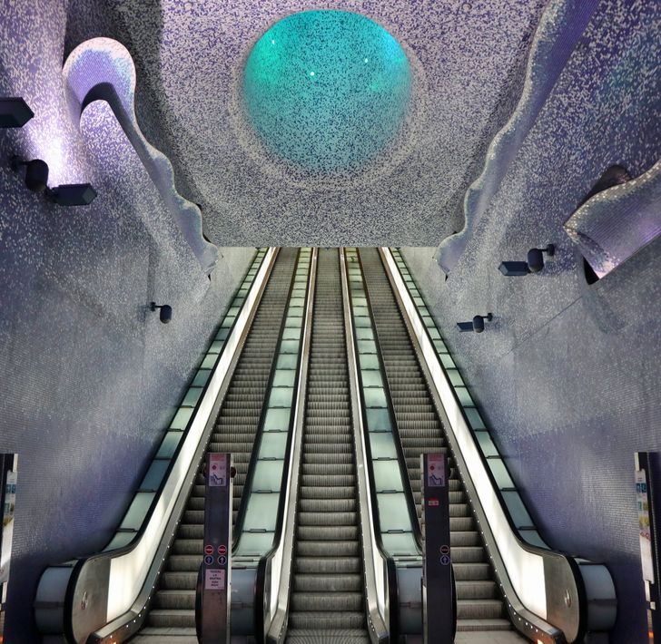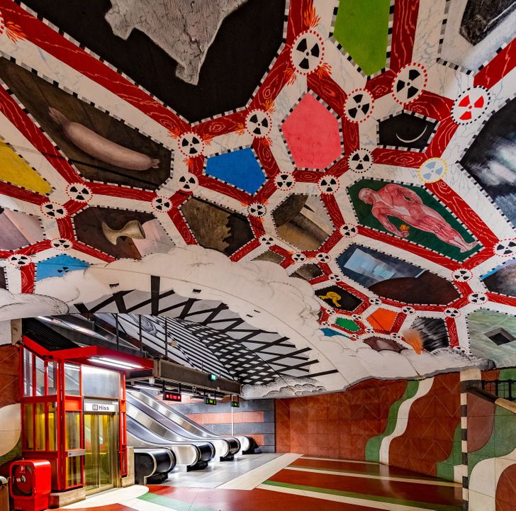▼瑞典斯德哥爾摩Tekniska Hgskolan站:這座車站建於1973年,主要是為了方便去往皇家理工學院。因為跟科學和創造息息相關,所以車站內有很多科學元素的裝飾。