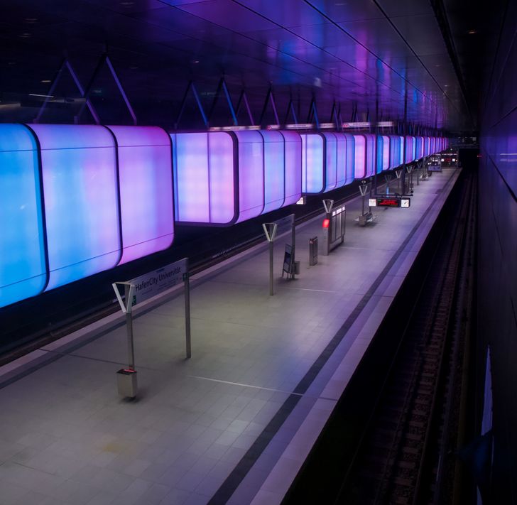 ▼德國漢堡的HafenCity University U-Bahn站:這座地鐵站有12座藝術裝置,鋼架和貨運貨櫃搭建的模塊在燈光中不斷變換色彩,再搭配古典音樂,將地鐵站變成了藝術館。