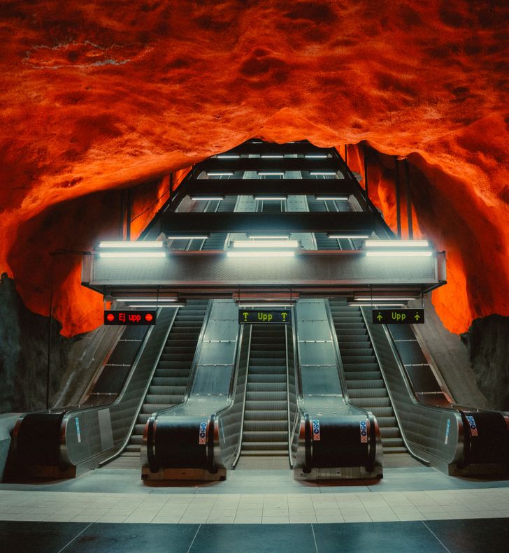 ▼瑞典斯德哥爾摩Solna Centrum站:這座地鐵站被稱為「地獄之門」,洞穴狀的「紅色天空」壓迫感十足。