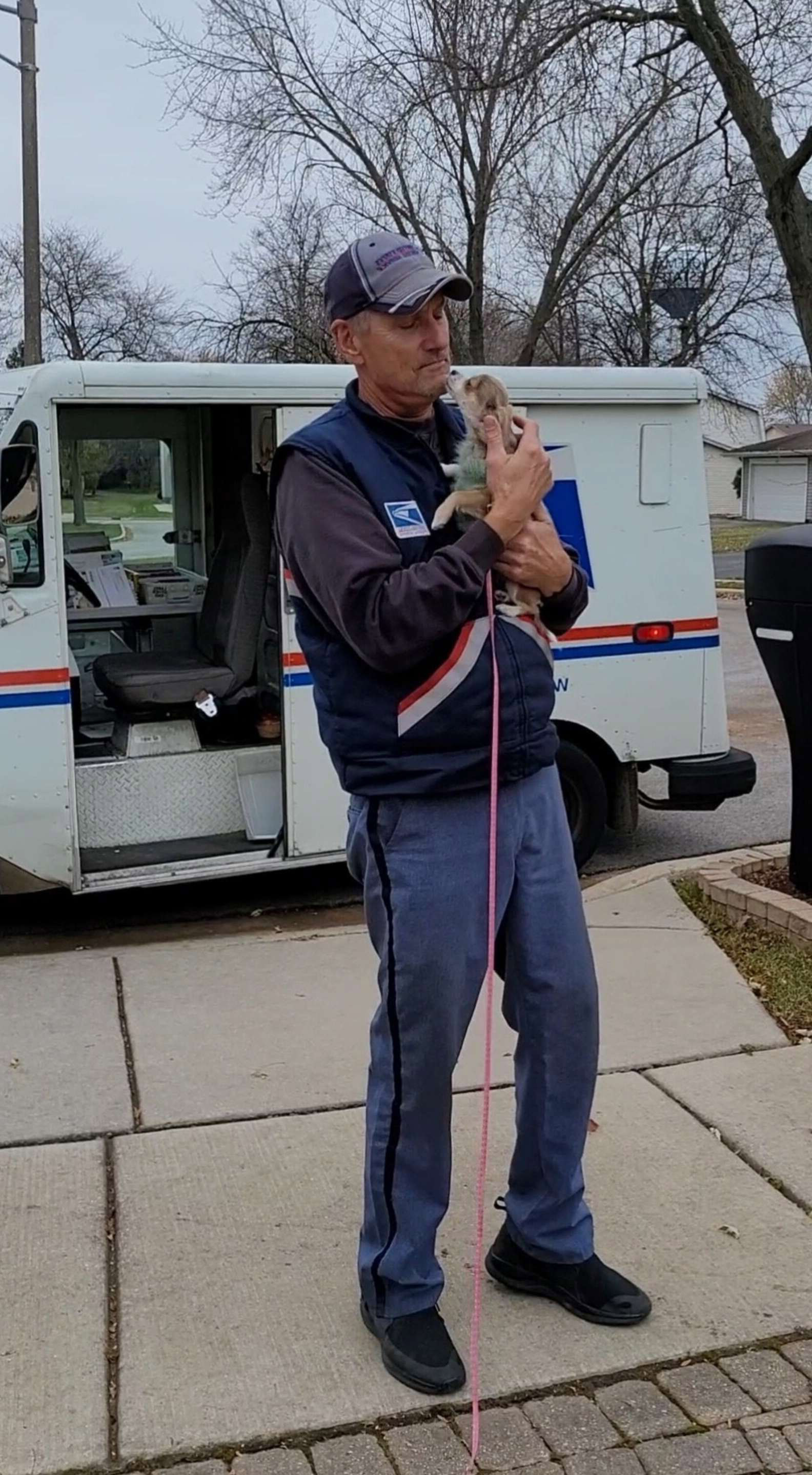 ▼當時Frannie剛剛來到家中,Lisa抱著牠去拿信件。她跟Dan聊了一會兒,問他是否願意抱一抱狗狗。Dan非常和善,很快就跟Frannie熟悉了起來。從那之後,Frannie每天都會在門口等待郵差的到來。