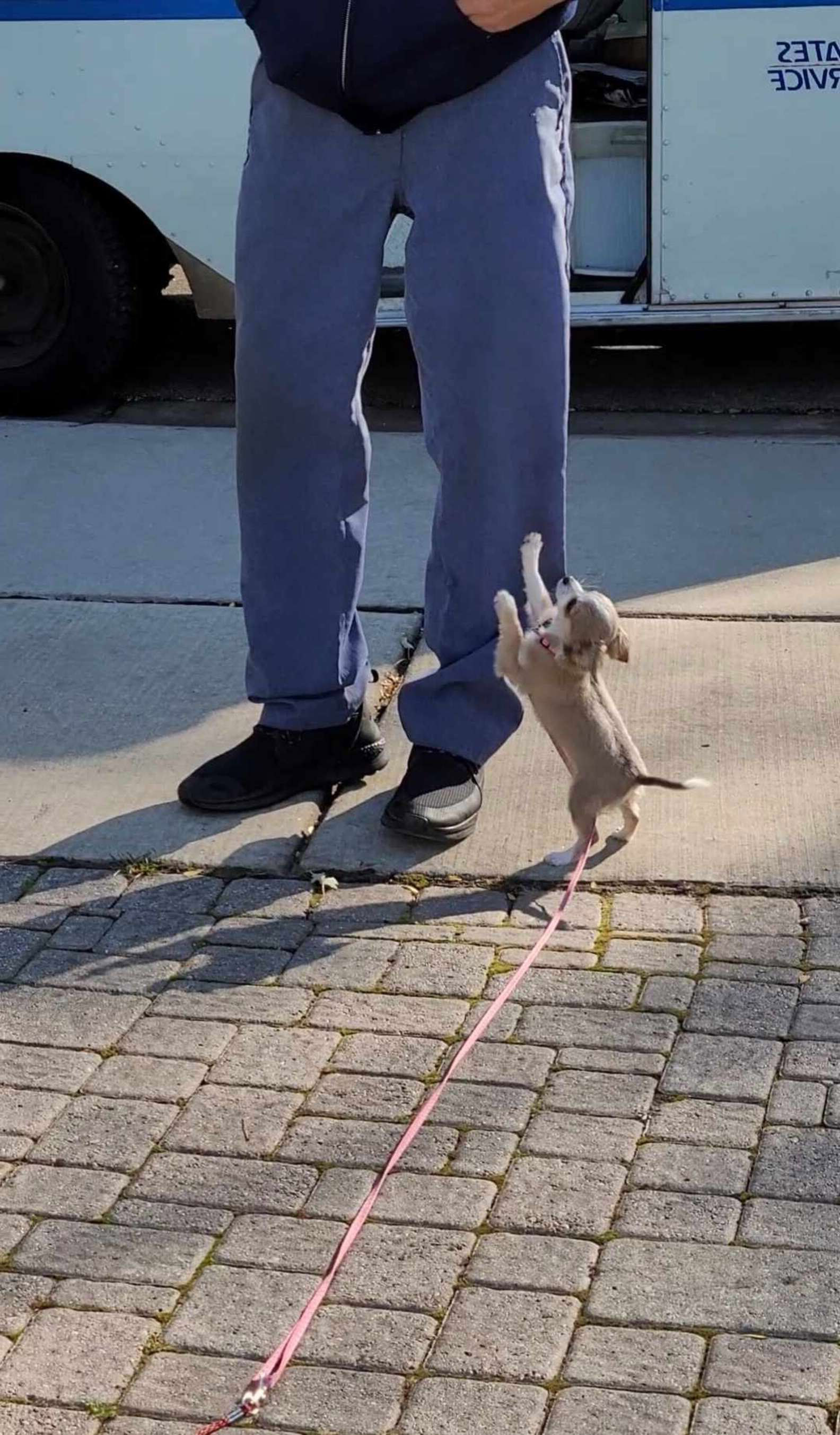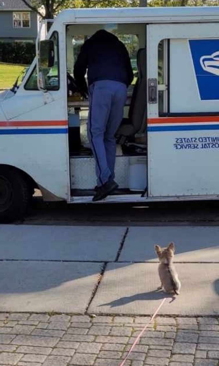 2023年06月30日狗狗跟郵差成為了好朋友~國外網友Lisa Laskey養了一隻5個月大的吉娃娃Frannie。這隻狗狗來到家不久,就跟負責這一區域的郵差Dan成為了好朋友。牠每天都會坐在家門口等待Dan的到來,只要郵差的車駛近,牠就會變得激動起來。