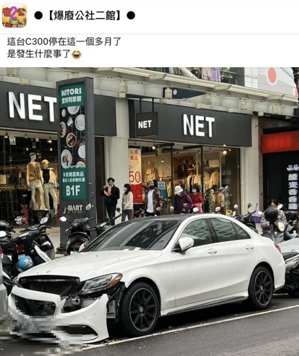 ▼原po表示,他連續1個多月都在路邊停車格看見同一台C300賓士停在這裡。那台賓士的車頭撞爛,明顯需要送修,但在路邊停了一個多月,車主仍沒有送去修理。原po好奇發問:「這台C300停在這一個多月了,是發生什麼事了?」