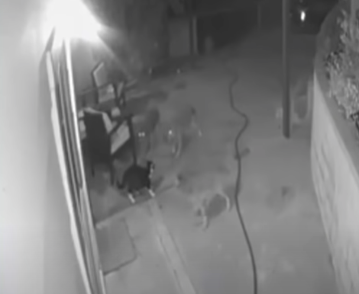 ▼事後瑪雅查看監視器影像,才發現他們開門之前,麥克斯已經跟郊狼對峙約30秒了,還好麥克斯沒有受傷。從影片中可以看到,郊狼試圖包圍麥克斯,但麥克斯非常勇敢,牠先衝過去嚇一隻郊狼,又轉頭衝向另外兩隻,全程氣勢滿滿、毫不退縮。
