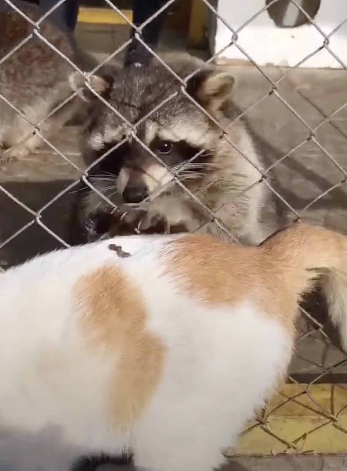 ▼這一天陽光明媚,貓咪想找地方曬太陽。牠發現浣熊籠子前很適合休息,就準備躺下小睡片刻。有人趁機在貓咪背上放了一點飼料,浣熊連忙伸出手拿取。飼料吃完後,浣熊還繼續東找西找。牠的手手在貓咪身上按來按去,就像在給貓咪按摩一樣。