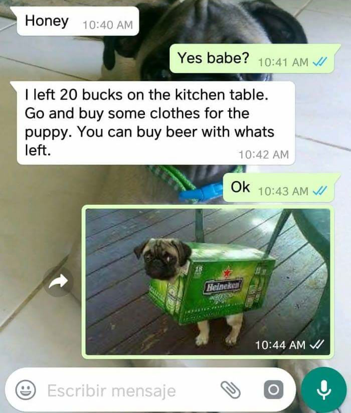 ▼老婆表示:「我留了20塊在桌上,去幫狗狗買一些衣服,剩下的錢你可以用來買酒。」