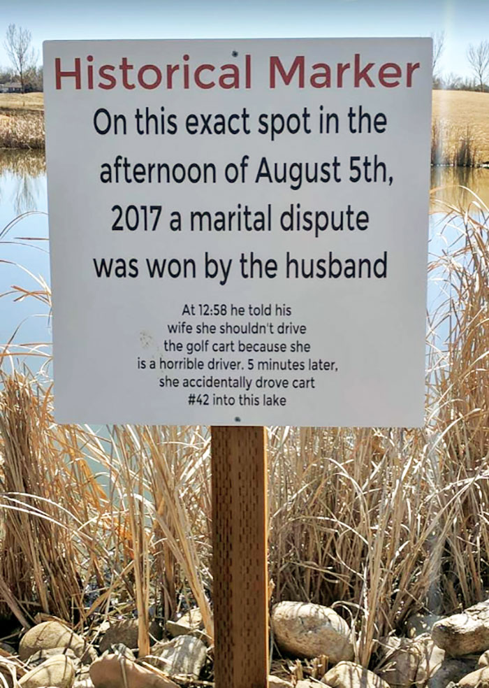 ▼「2017年8月5日,這裡發生了一場婚姻糾紛,最後由老公勝出。在12:58分,他告訴老婆她無法駕馭高爾夫球車,因為她的駕駛技術太爛了。5分鐘後,老婆不小心將42號車開進了這個湖中。」