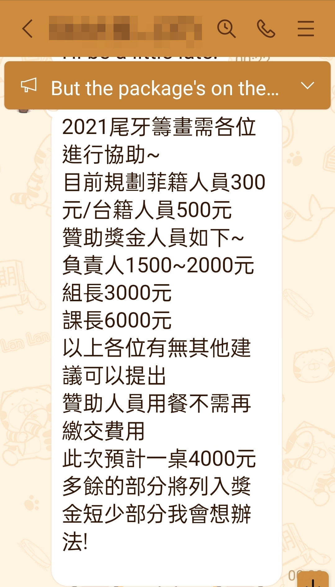 原po貼出了公司LINE群組「2021尾牙籌畫需各位進行協助」公告:「目前規劃菲籍人員300元,台籍人員500元,贊助獎金人員如下,負責人1500-2000元、組長3000元、課長6000元。」公告上還說,這次尾牙一桌預計4000元,贊助人員用餐不需要再繳交費用,多餘的錢會列入獎金,短少的部分公司會再想辦法。