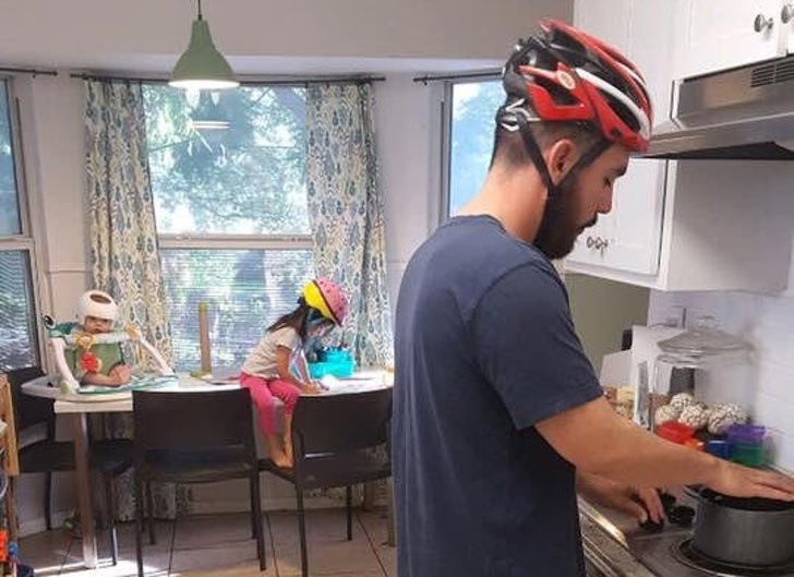 ▼15.小孩為了矯正頭型,需要戴塑形頭盔。爸爸也戴上頭盔陪她。