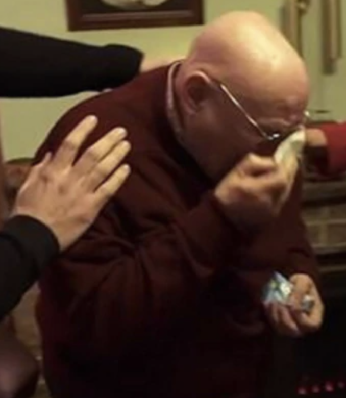 ▼Terrence參加了英國最大的銀髮服務組織Age UK,在這一組織的牽線搭橋下,才登上了「BBC早餐」節目。主持人Dan Walker和奧爾德姆學院(Oldham College)的學生們聽到他的故事後,在聖誕節時特別去拜訪他,給了他一個大驚喜。學生們精心裝飾聖誕樹,並齊唱《平安夜之歌》,Terrence打開門看到這一幕時,感動地流下了眼淚。