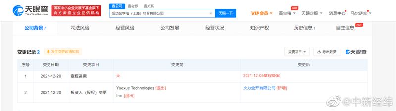 ▼據「鳳凰網娛樂」報導,一家名為「成功金字塔」的科貿公司在20日發生工商變更,原股東公司YUEXUE TECHNOLOGIES,INC.無預警退出,接手者則是王力宏主導的「火力全開有限公司」,而且是100%全資持股。目前「成功金字塔」的法定代表人及執行董事為WANG ALEXANDER LEE HOM(王力宏)。