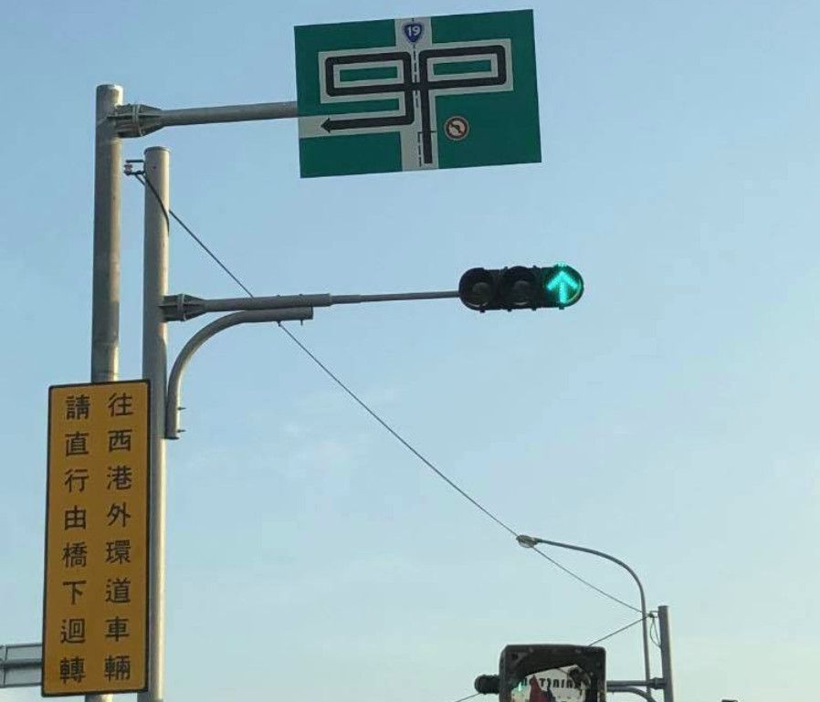 ▼有網友認出照片中的地點,原來這是台南市西港區,西港大橋下新開的路,「台19線的特別9P走向指示牌」。網友介紹說,這樣設計是因為橋上有分隔島,所以沒辦法直接左轉。雖然看起來複雜,但有台南人覺得很棒:「認真希望台南市區內也能這樣,很多路口已經很小了,還在內線等左轉佔車道,原本內線直行的還要想辦法彎出去外線才能繼續直行,這車能不塞嗎?」
