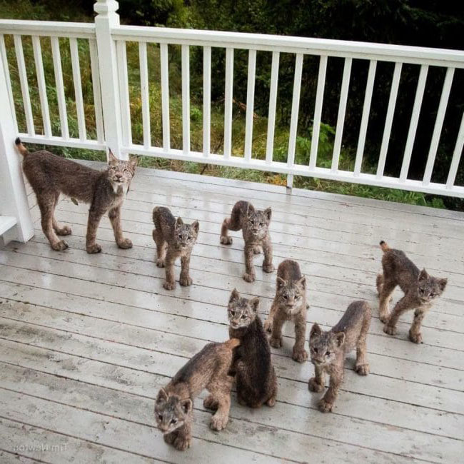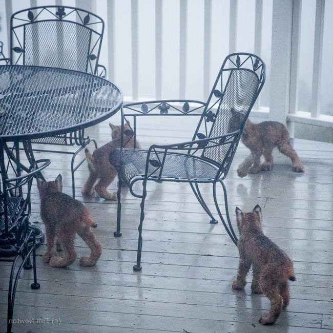 2023年07月22日阿拉斯加網友Tim Newton住在自然生態區附近,經常有野生動物跑到他家的後院玩耍。有一天早晨,Tim被窗外的噪音驚醒,他怒氣沖沖拉開窗簾查看,竟發現猞猁媽媽帶著寶寶們在他家的後院玩耍,牠們跑來跑去、互相玩鬧,把Tim家的後院當成了遊樂場~