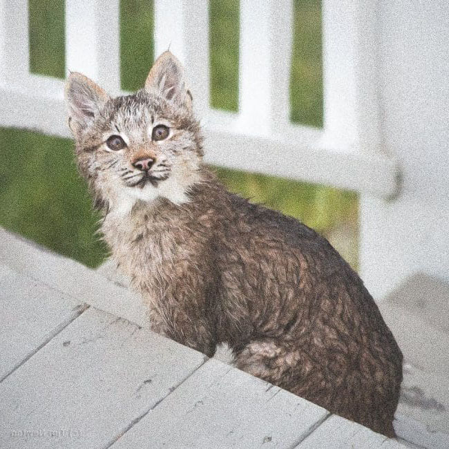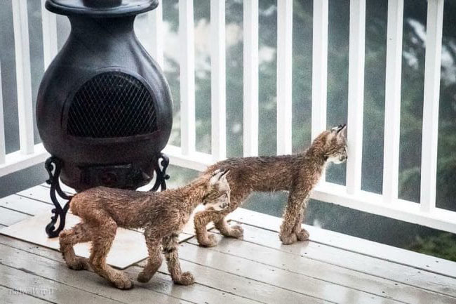 ▼猞猁寶寶們在陽台上玩了40分鐘,Tim全程躲在窗戶一邊拍攝。其中一隻小猞猁似乎注意到了他,好奇地來到他身邊。Tim說:「我不知道當時自己在想什麼,也許只是想跟牠打招呼吧-我把相機從我臉前往下移了一點點,把眼睛露出來,當時牠的表情真的是嚇傻了!牠的眼睛突然睜大,然後轉身逃跑!好險其他猞猁沒有發現狀況。」